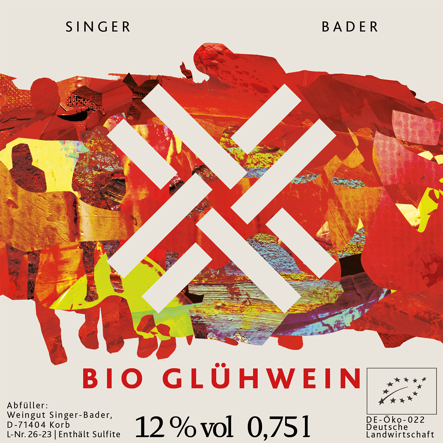 Hinweis: Deutscher roter Glühwein. Gutsabfüllung Weingut Singer-Bader, Rosenstr. 1, D-71404 Korb. Bio-Wein DE-ÖKO-022. Enthält Sulfite. Lebensmittel sind gekennzeichnet.